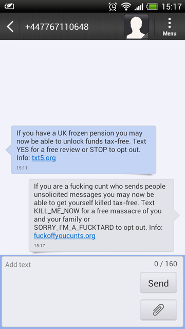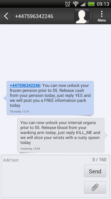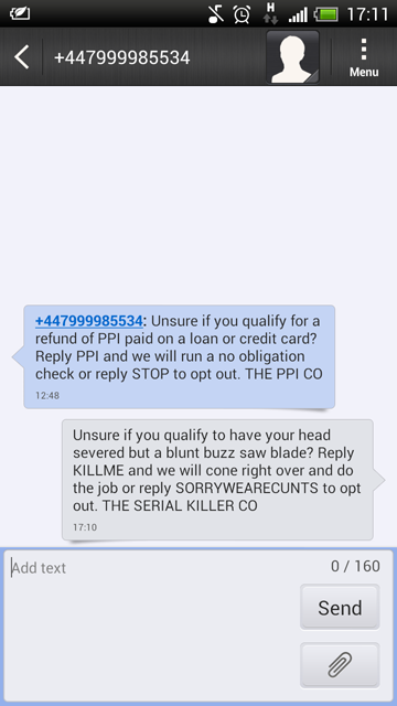 I keep getting spam texts. So I've stated sending replies. Here are some of them.